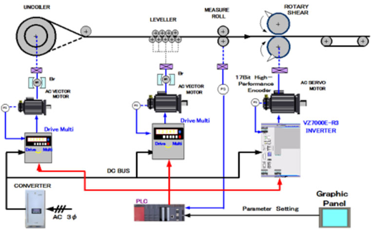 本系統(tǒng)采用矢量電機(jī)控制,具有速度/張力控制精度高等優(yōu)異特點(diǎn),控制系統(tǒng)有三種模式(雙活套、單活套、重卷直拉)可切換,使用共直流母線方式,使再生發(fā)電負(fù)載回收能量。提高效率,降低不良量,廣泛受到諸如寶鋼、武鋼、鞍鋼、本鋼、中鋁等大型企業(yè)的青睞。